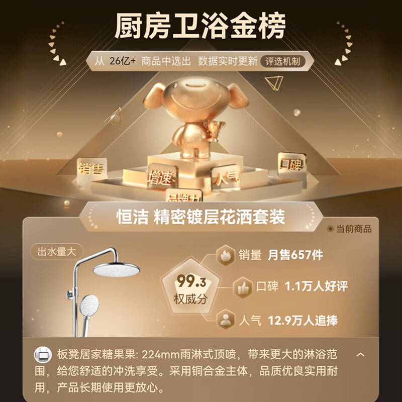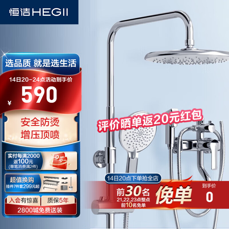 恒洁(HEGII)淋浴花洒套装 手持增压花洒全套 大雨淋顶喷花洒HMF916-601B价格:590.00元!