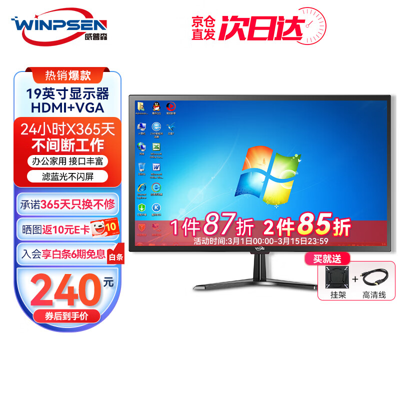 威普森(WINPSEN)19英寸显示器 LED高清监视器 家用办公工业安防监控电脑显示屏 HDMI+VGA接口 可壁挂价格:299.00元!