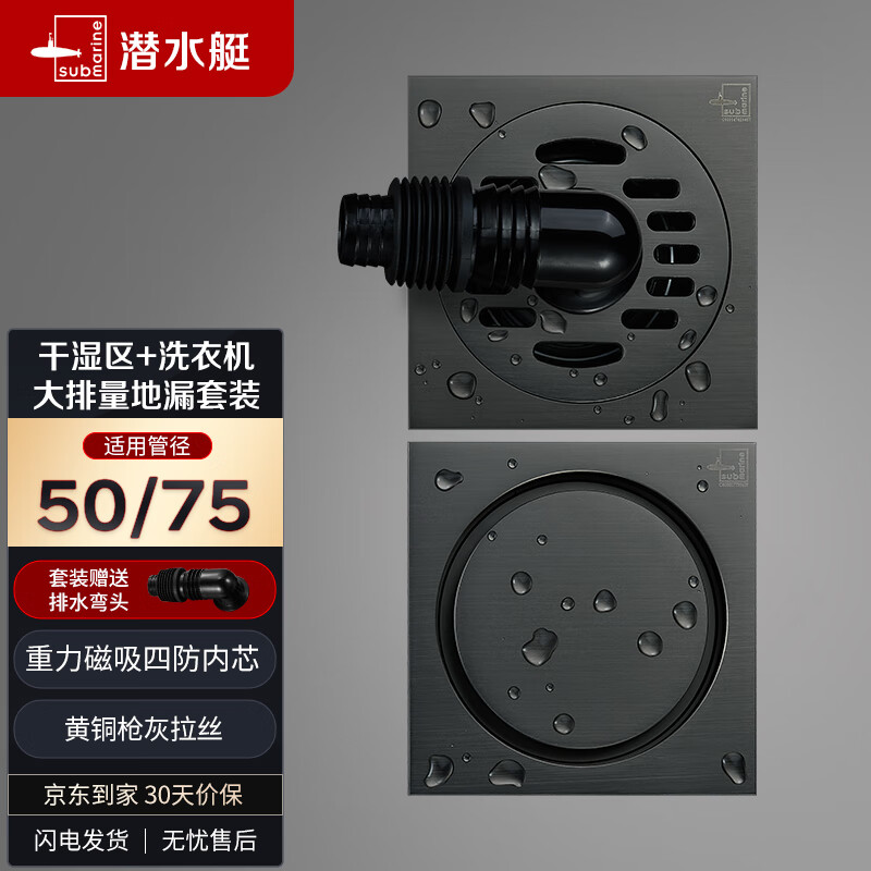 潜水艇(Submarine)黄铜镀镍枪灰色拉丝面防臭地漏套装50管 静雅干湿区+洗衣机地漏价格:223.00元!