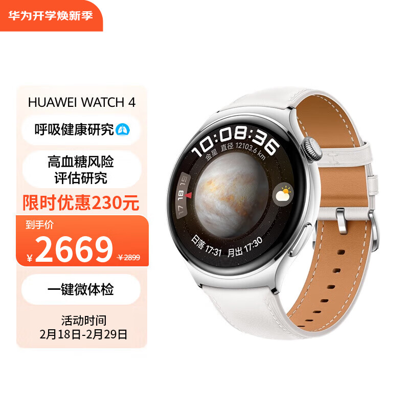 华为(HUAWEI) WATCH 4 金星白 46mm表盘 eSIM独立通话 高血糖风险评估研究 微信手表版 华为运动智能手表价格:2639.00元!