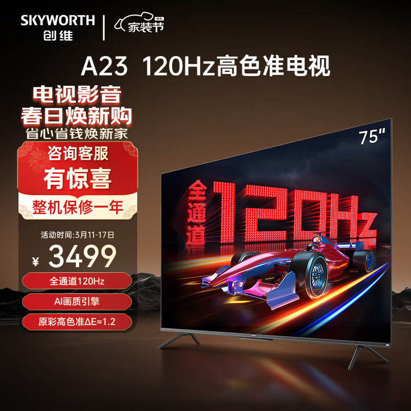 创维电视75A23 75英寸电视机全通道120Hz 3+32G4K超高清护眼声控屏智能液晶价格:3499.00元!
