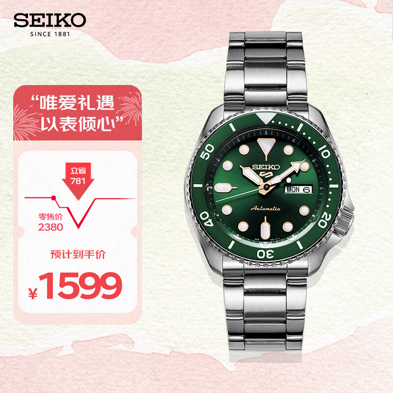 精工(SEIKO)手表 日韩表绿水鬼100米防水机械男士腕表SRPD63K1 生日礼物价格:1599.00元!