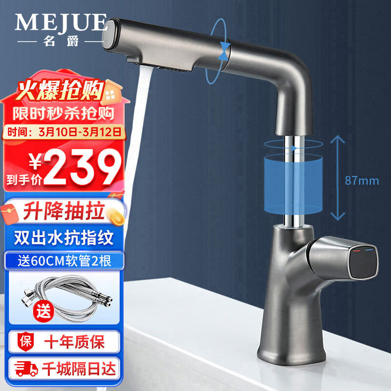 名爵(MEJUE)升降抽拉式冷热龙头浴室卫生间洗脸盆360°多功能旋转龙头Z-012352价格:299.00元!