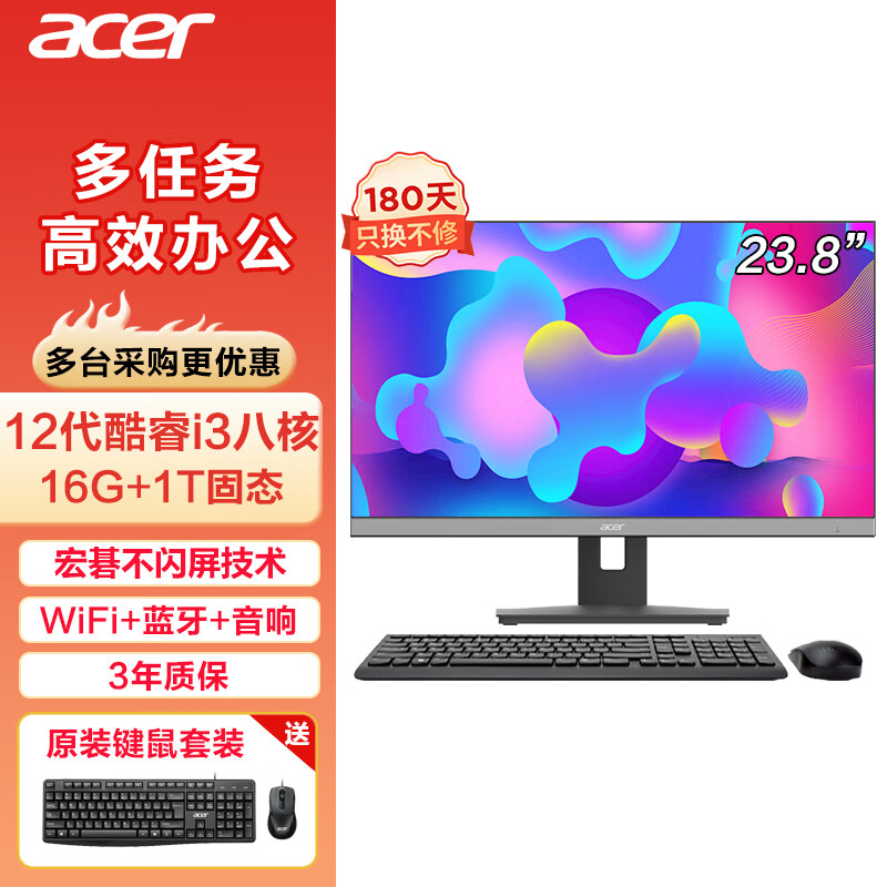 宏碁(acer)商祺 一体台式机电脑 23.8英寸(酷睿 12代 i3-N305 16G 1TG SSD)不闪屏 办公商用家用 定制版价格:2749.00元!