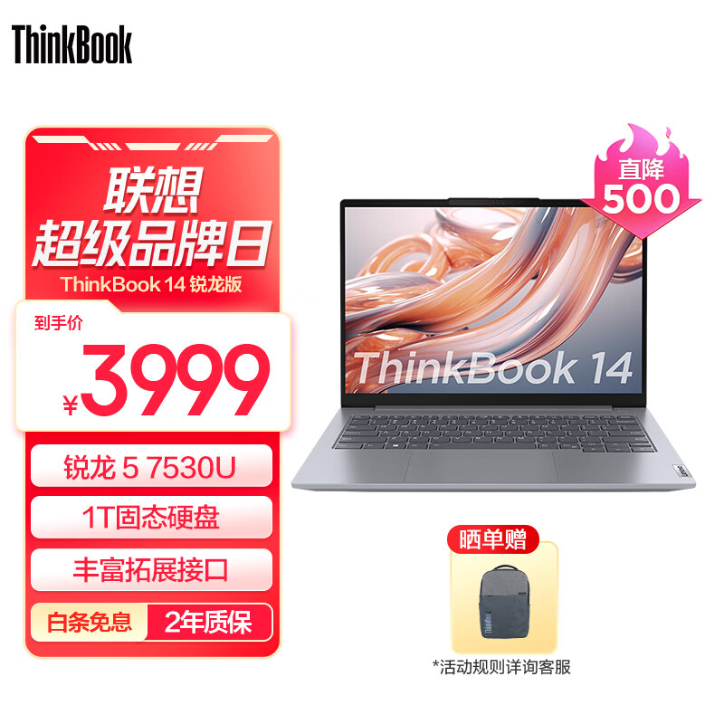 ThinkPad联想ThinkBook 14/16锐龙版 商务轻薄笔记本电脑 14英寸:R5-7530U 16G 1T 23CD价格:4499.00元!