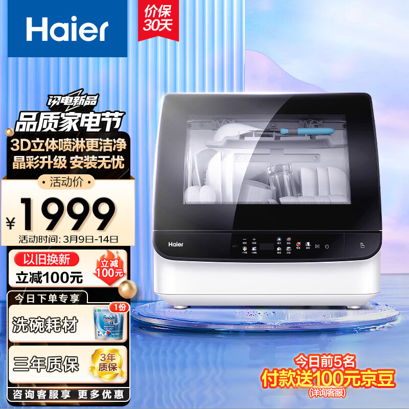 海尔(Haier)洗碗机台式家用2-4口之家 晶彩屏高温除菌变频洗碗机 小海贝ETW42286BKU1价格:1999.00元!