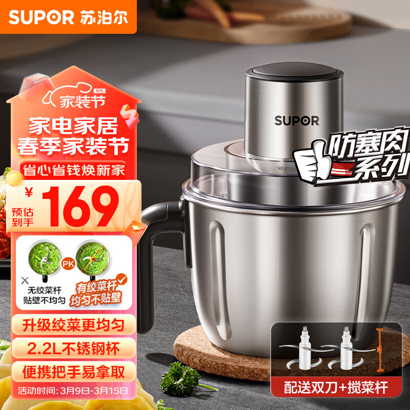 苏泊尔(SUPOR)绞肉机 绞馅机 家用多功能碎肉机不锈钢搅馅搅菜搅肉机2.2大容量料理机搅拌机 JR56S-U价格:169.00元!