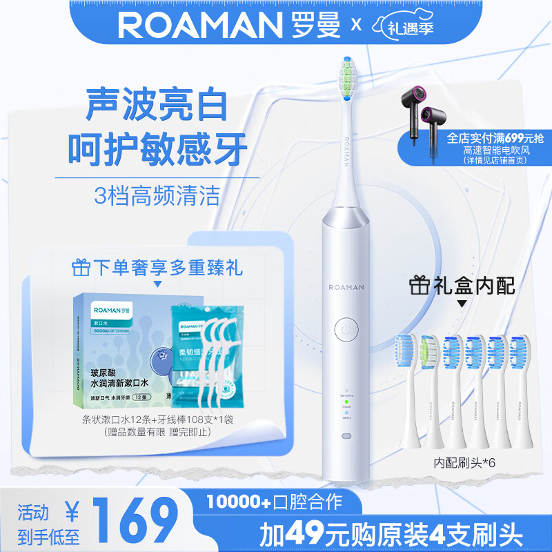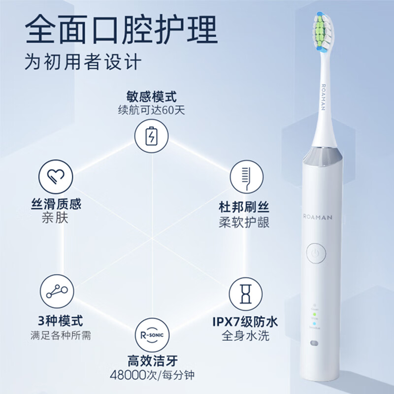 罗曼(ROAMAN)电动牙刷情侣款节日礼物礼物 入门款 3种模式洁牙护龈 6支杜邦刷头 T3增配银色款 新年礼物价格:169.00元!