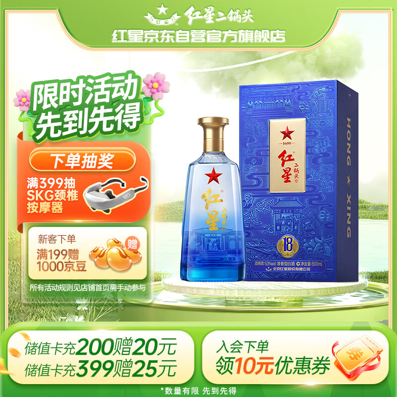 红星二锅头蓝盒18 清香型白酒 53度 500ml 单瓶装价格:158.00元!
