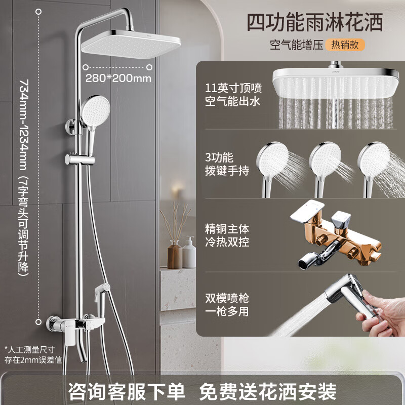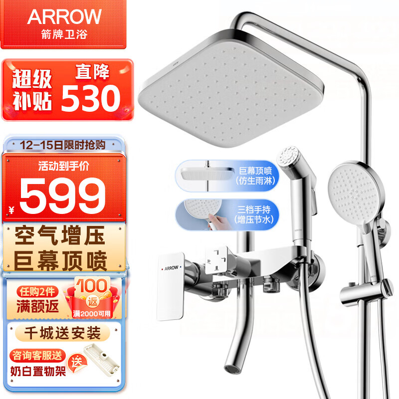 箭牌(ARROW) 淋浴花洒套装铜龙头沐浴家用浴室淋雨喷头顶喷花洒冷热淋浴喷头 【B款】巨幕增压四功能花洒3405M价格:599.00元!