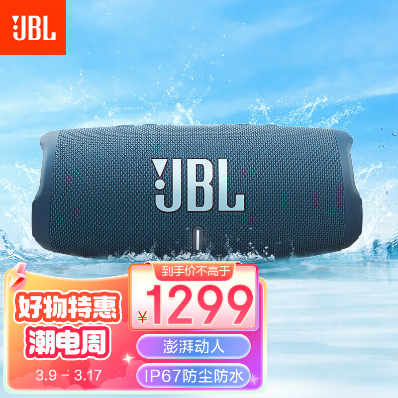 JBL CHARGE5 音乐冲击波五代 便携式蓝牙音箱+低音炮 户外防水防尘 桌面音响 增强版赛道扬声器 蓝色价格:1599.00元!