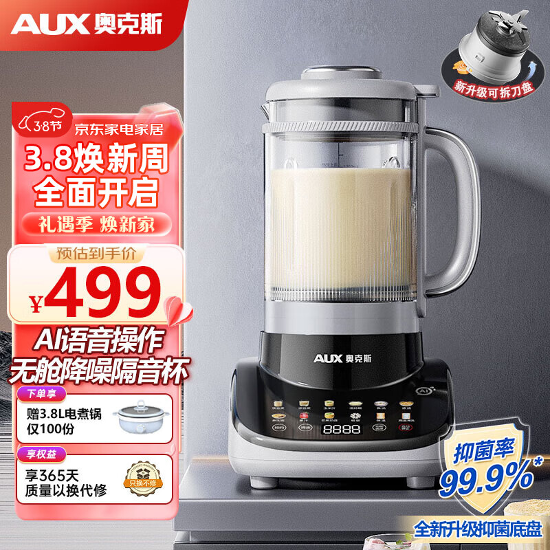 奥克斯柔音破壁机智能AI语音操作多功能家用豆浆机1.5L大容量料理机全自动可拆洗预约APB-08A2B09价格:499.00元!