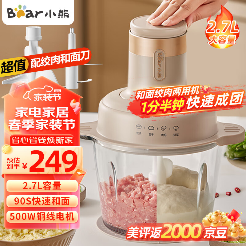 小熊(Bear)绞肉机家用 和面机 多功能揉面搅面绞馅机 打肉饺子肉馅碎肉机 搅肉机2.7L大容量 QSJ-P05A5价格:249.00元!