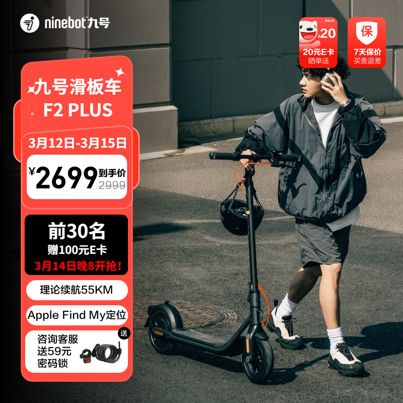 Ninebot 九号电动滑板车成人F2Plus 便携可折叠智能九号电动车自修复胎55KM长续航(支持充气宝)价格:2599.00元!