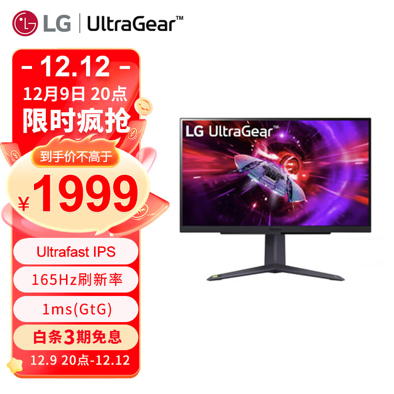 LG 27英寸 UltraFast IPS 2K 165Hz HDR10 1ms(GtG) sRGB 99% 旋转倾斜 窄边框 高刷电竞显示器 27GR75Q价格:2099.00元!