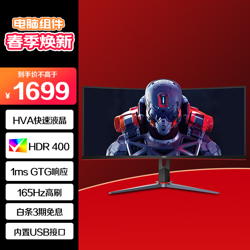 AOC 34英寸 带鱼屏 WQHD 165Hz HDR400 HVA快速液晶1ms 出厂校色 21:9曲面电竞显示器CU34G2XP价格:1999.00元!