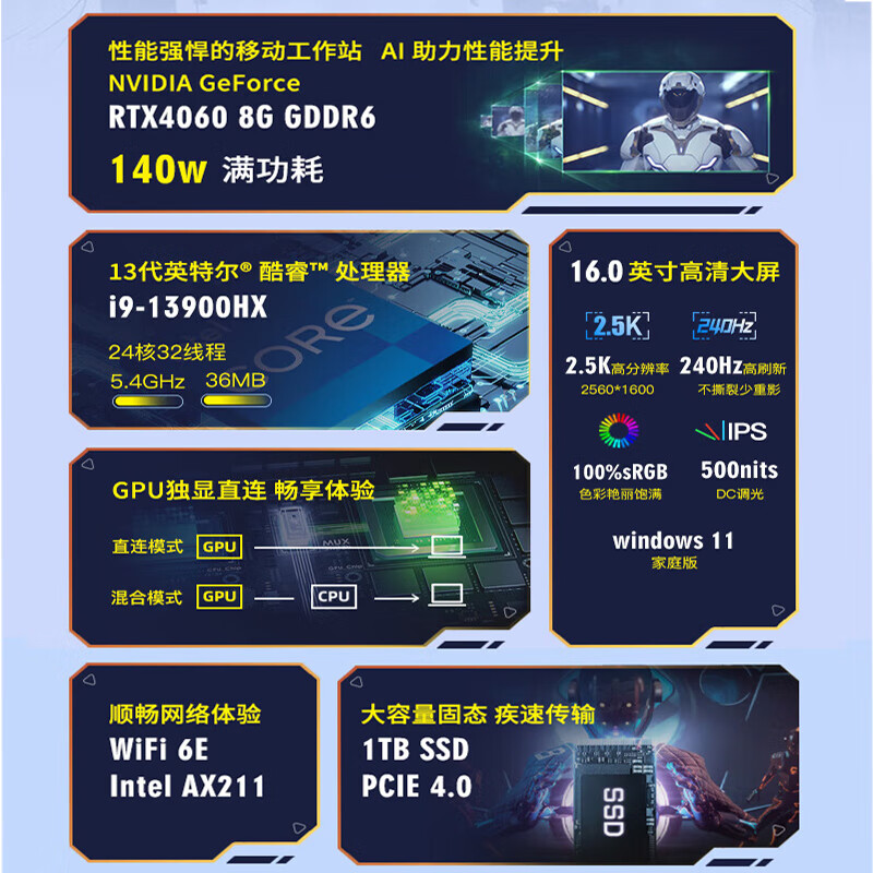 神舟(HASEE)战神T8 13代英特尔酷睿i9 16英寸笔记本电脑(13代i9-13900HX RTX4060 240Hz 2.5K电竞屏)价格:7999.00元!