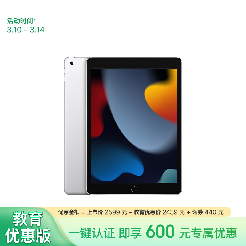 Apple/苹果【教育优惠】iPad 10.2英寸平板电脑 2021款(64GB WLAN版/MK2L3CH/A)银色价格:2439.00元!