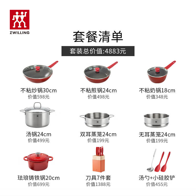 双立人(ZWILLING)锅具套装不粘锅炒锅煎锅奶锅珐琅炖锅汤锅蒸锅全套 幸福婚嫁厨具价格:2198.00元!