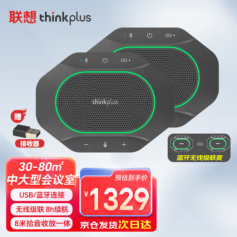 ThinkPlus联想视频会议全向麦克风8米拾音器免驱蓝牙无线级联同收同放适用桌面型扬声器30~80㎡MK-MC600*2价格:1398.00元!