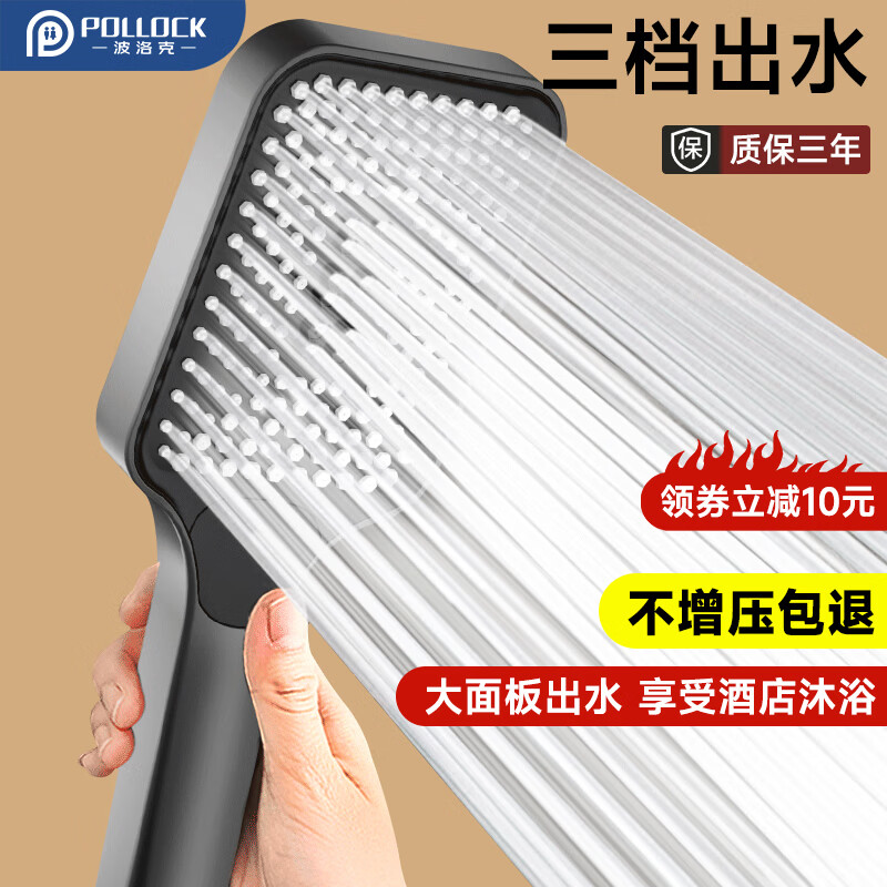 波洛克(Pollock)淋浴增压花洒喷头大面板手持家用浴室加压多功能洗澡莲蓬头3档价格:59.00元!