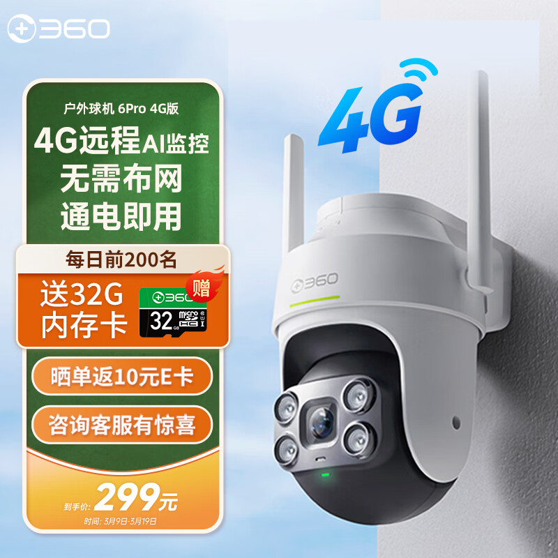 360户外球机6 Pro 4G版400W超清室外摄像头360°全景视野防水防尘监控手机远程AI人形追踪家用摄像头价格:299.00元!