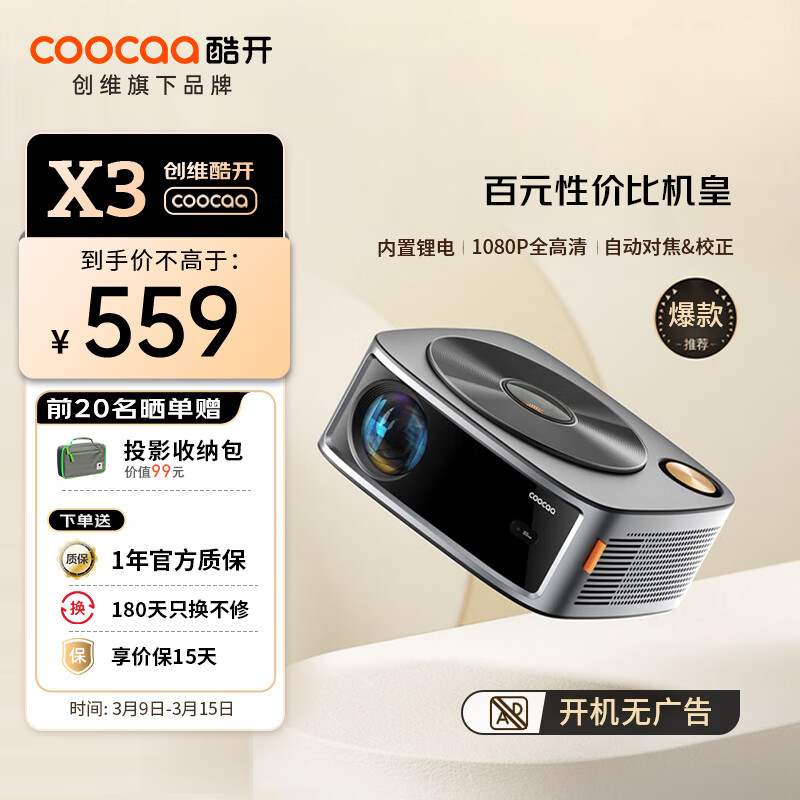 酷开X3投影仪家用智能卧室 便携户外露营家庭影院投影机 (内置电池 1080P全高清 自动校正)价格:649.00元!