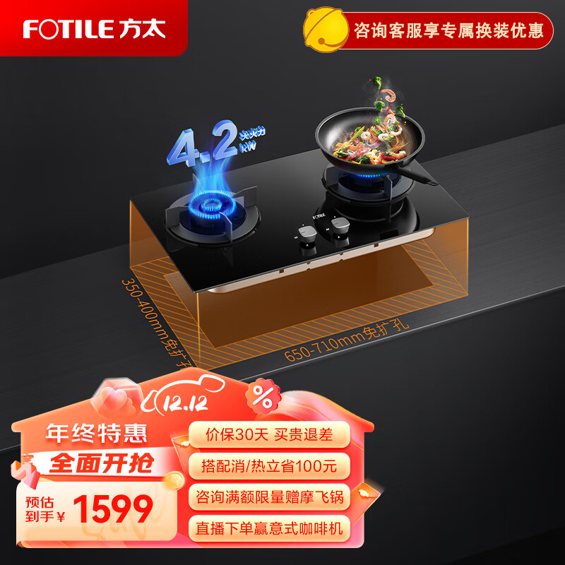 方太燃气灶(液化气)家用嵌入式猛火双灶台 灶具 4.2kW*大火力 换装不改孔 01-TH21B价格:1599.00元!