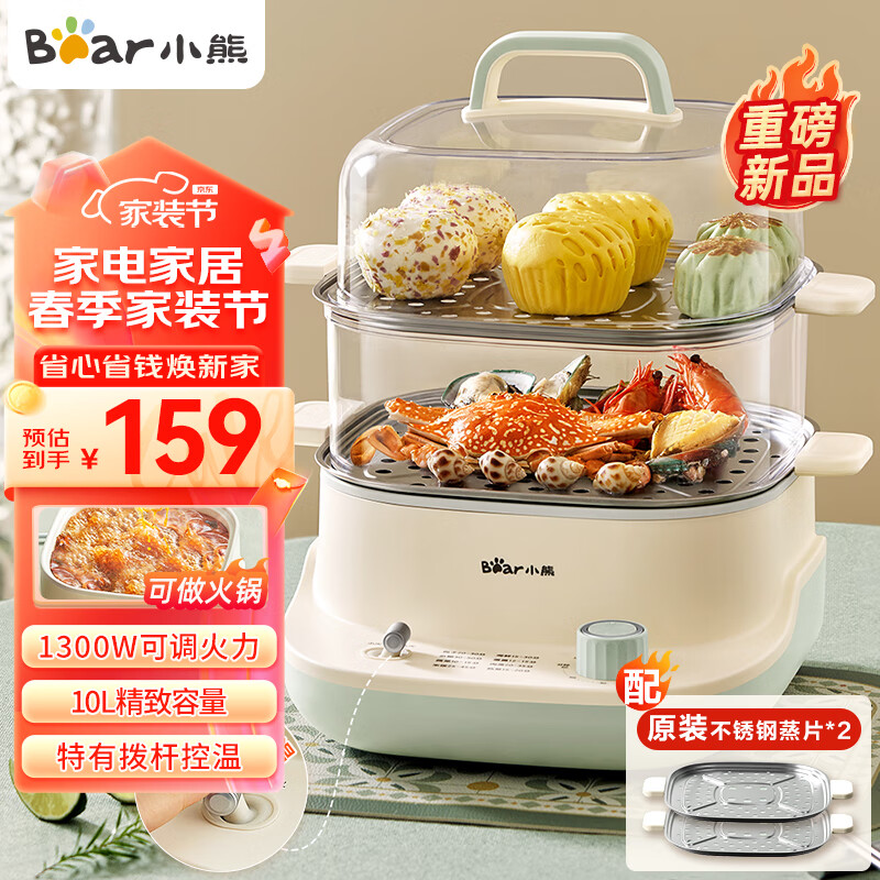 小熊(Bear)电蒸锅 小火锅电锅2-3人 蒸锅家用 10L多功能早餐包子电热煮锅定时可调火力不锈钢蒸盘DZG-CA0H1价格:159.00元!
