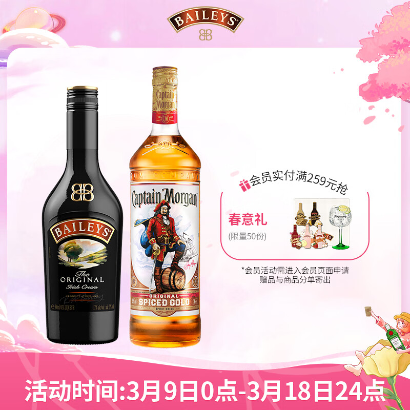 百利(Baileys)甜酒 力娇酒利口酒 原味500ml+摩根船长金朗姆酒 调酒基酒700ml价格:119.00元!