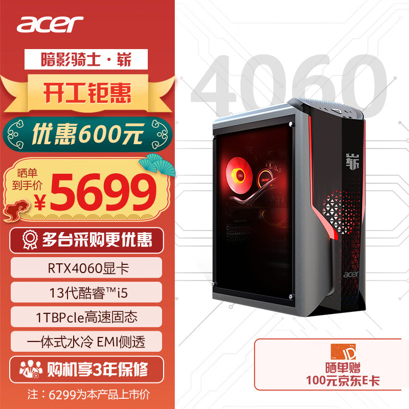 宏碁(acer)暗影骑士·崭 N95游戏电脑台式机(酷睿13代i5 16G+1TB固态硬盘 RTX4060 EMI侧透 一体式水冷散热)价格:5799.00元!