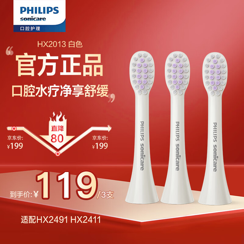 飞利浦(PHILIPS)电动牙刷头 全新柔韧小刷头 杜邦刷毛 3支装HX2013/02白色 适配HX2491水疗刷系列价格:119.00元!