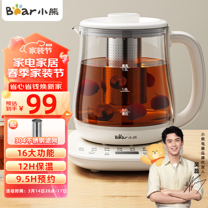 小熊(Bear)养生壶 煮茶壶 烧水壶 可拆卸茶篮煮茶器多段保温迷你玻璃花茶壶电热水壶1.5L电水壶 YSH-D15V9价格:109.00元!