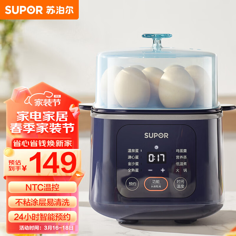苏泊尔(SUPOR)煮蛋器 蒸蛋器 电蒸锅煮鸡蛋神器 微电脑预约可定时自动断电 家用蒸鸡蛋溏心蛋多用途锅 Z15FC856价格:139.00元!