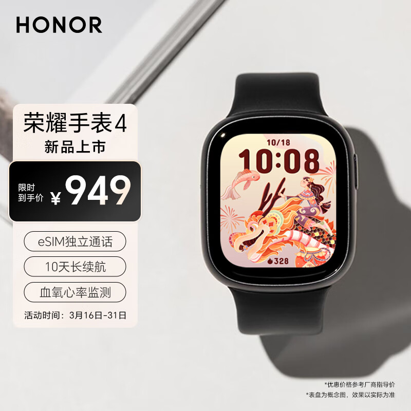 荣耀手表4 曜石黑 eSIM独立通话 10天长续航 全智能手表 男女运动手表 血氧心率监测 龙年表盘新年礼物价格:949.00元!