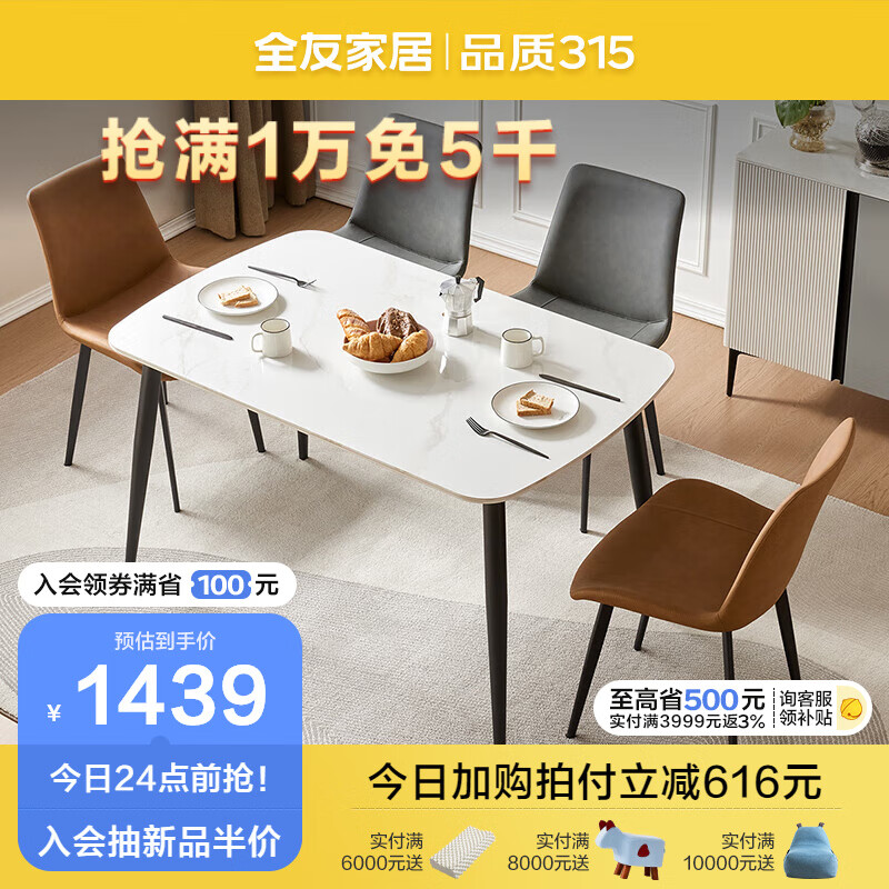 全友家居 餐桌耐用岩板台面长条桌餐厅稳固金属框架吃饭桌子DW1179价格:2055.71元!