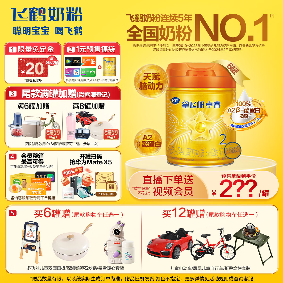 飞鹤【5年No.1】星飞帆卓睿A2酪蛋白2段(6-12月)配方奶粉758g *6价格:2017.80元!