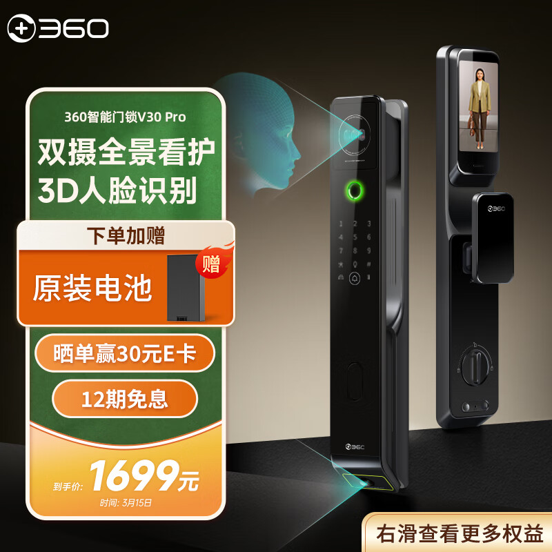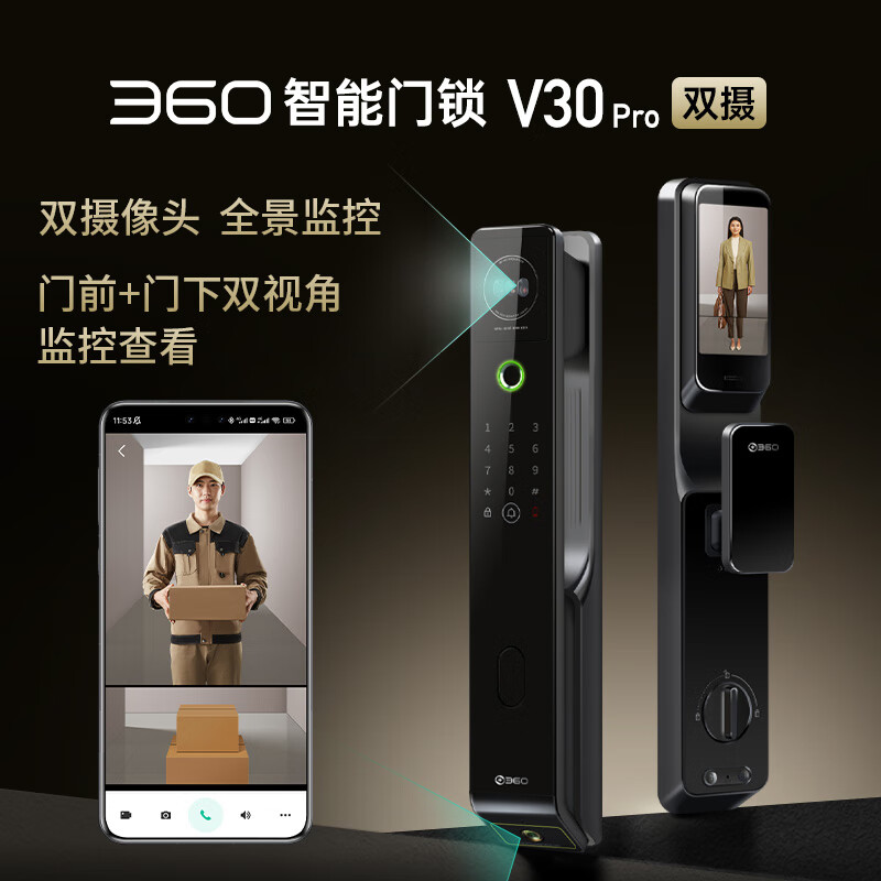 360智能门锁V30pro 3D人脸识别智能锁 双摄全景监控 可视猫眼大屏指纹锁电子锁密码锁防盗门锁NFC价格:1699.00元!