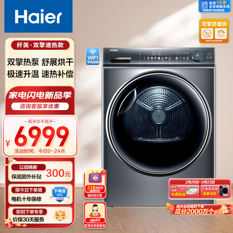 海尔(Haier)纤美烘干机家用 10公斤双擎热泵干衣机 空净过滤系统 静筒柔烘EHGS100FMATE81U1 以旧换新价格:6999.00元!