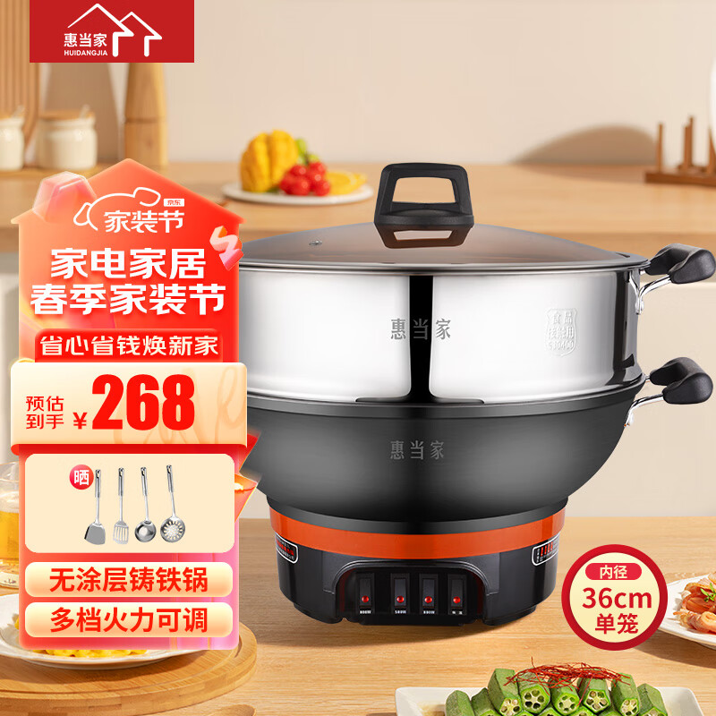 惠当家(Hui Dang Jia)电炒锅多功能电热锅电锅加厚电蒸锅电煮锅一体铸铁锅电火锅多用途锅 铸铁锅身-36cm单笼 6L价格:278.00元!