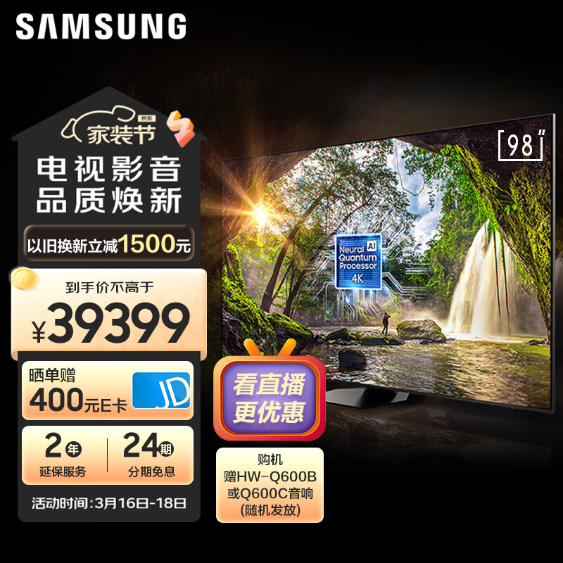 三星(SAMSUNG)98Q80Z 98英寸QLED量子点 AI智能补帧120Hz高刷 平板液晶电视 无开机广告 QA98Q80ZAJXXZ 100价格:39399.00元!