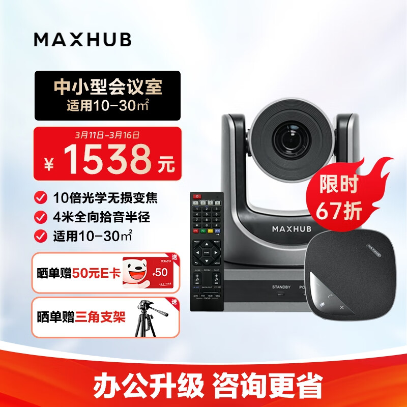 MAXHUB视频会议套装4米拾音半径全向麦克风BM10A+10倍光学变焦1080P高清会议摄像头SC51S价格:1538.00元!