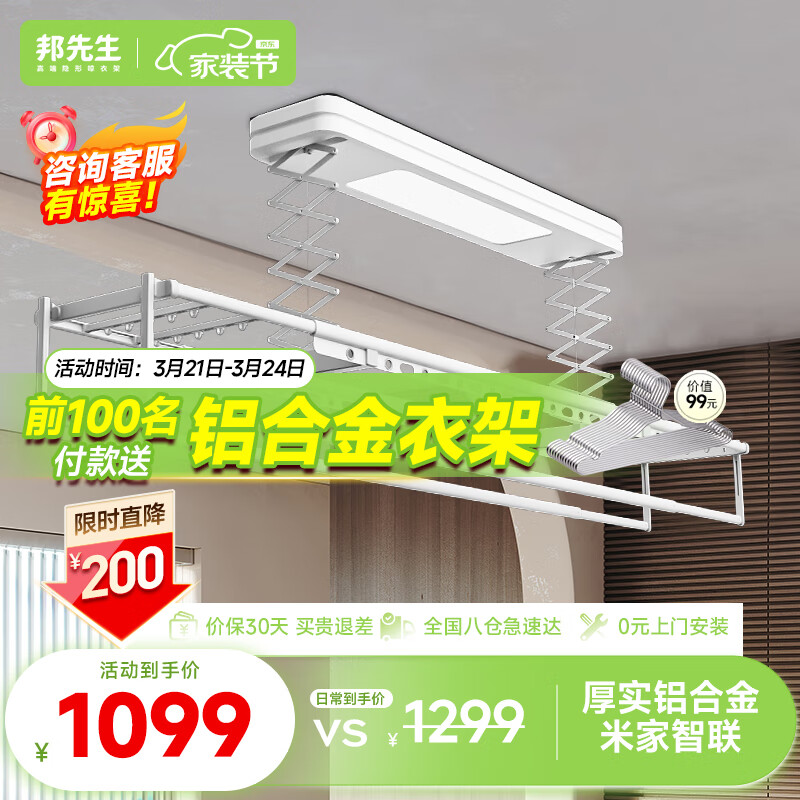 邦先生智能电动晾衣架阳台全自动升降小户型米家用凉衣杆晒衣机M50S米家价格:1299.00元!