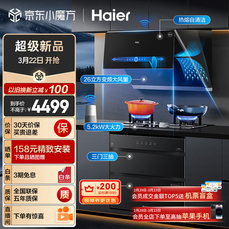 海尔(Haier)抽油烟机 烟灶消三件套 变频 26立方大吸力5.2kw大火力 110L三抽医疗级消毒柜EC911+Q2BE3天+EB031价格:4499.00元!