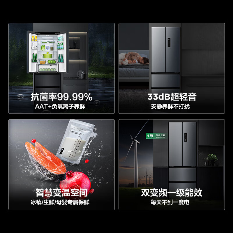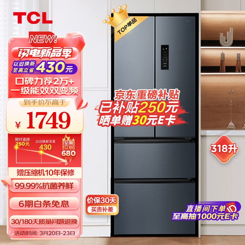 TCL 318升V5法式养鲜冰箱变频一级分区养鲜多门对开门超薄家用电冰箱 一级能效 33分贝轻音R318V5-D价格:1749.00元!