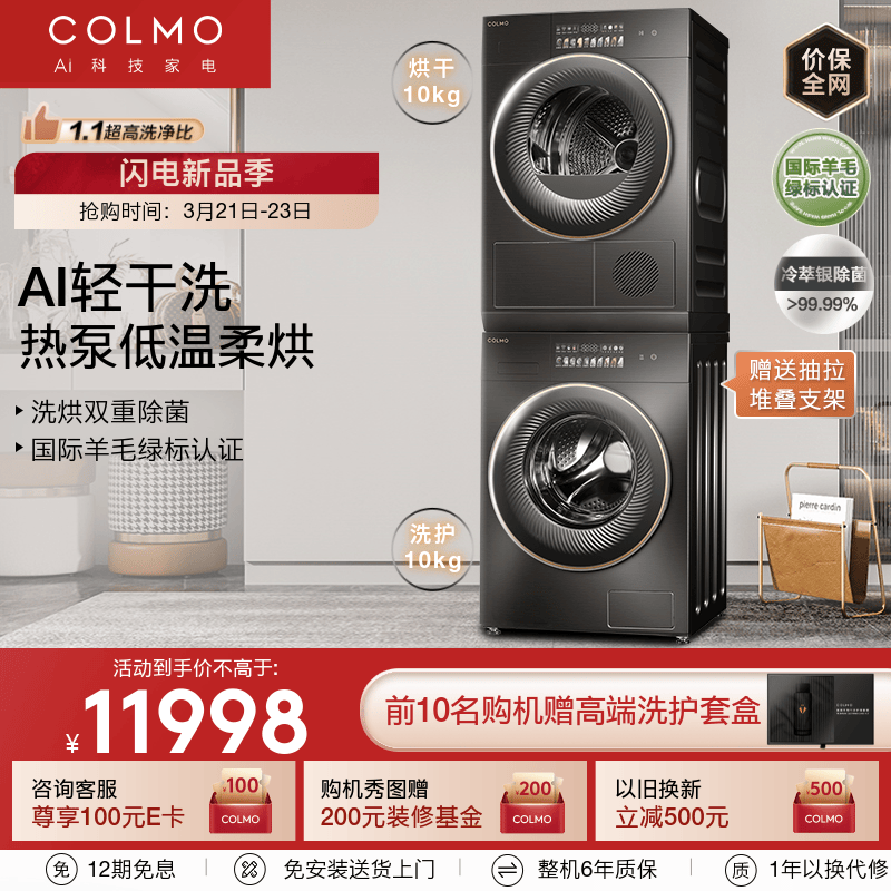 COLMO洗烘套装 滚筒洗衣机全自动+热泵式烘干机 AI轻干洗 AI超感知 画境系列 CLGZ10HD+CLHZ10HD价格:11998.00元!