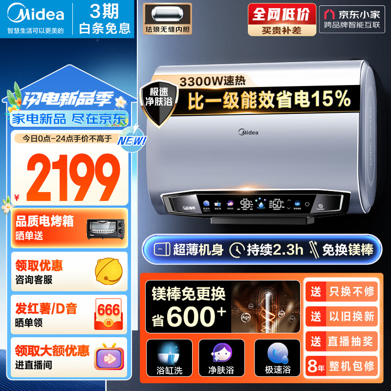 美的(Midea)60升玲珑超薄双胆扁桶电热水器3300W变频 镁棒免换12倍增容一级能效F6032-UD(HE)京东小家价格:2399.00元!