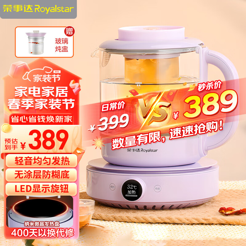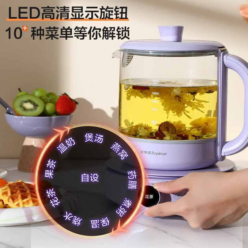 荣事达(Royalstar)养生壶燕窝壶多功能1.5L防糊底家用办公室预约煮茶壶电水壶电热水壶花茶壶 带玻璃炖盅 YSH15F16价格:389.00元!