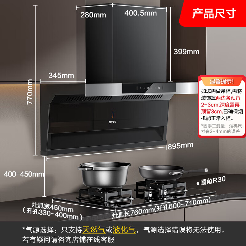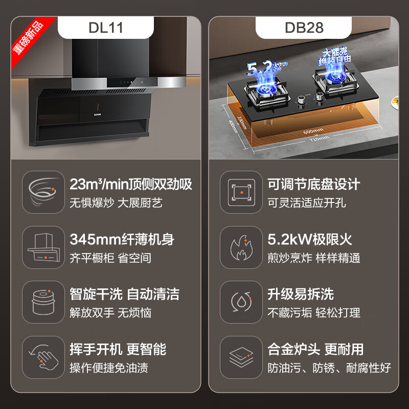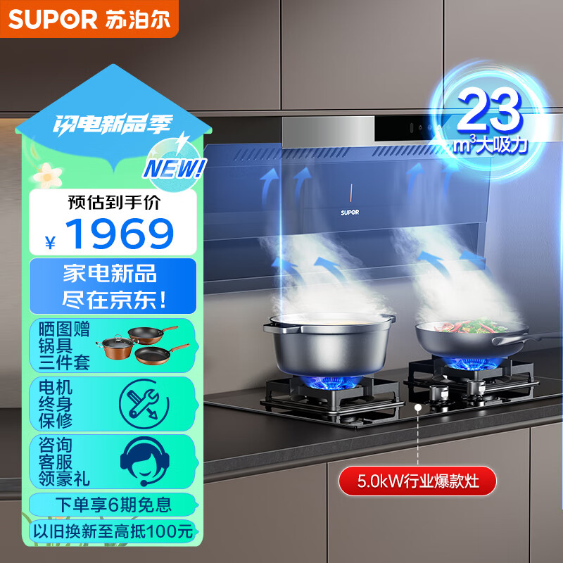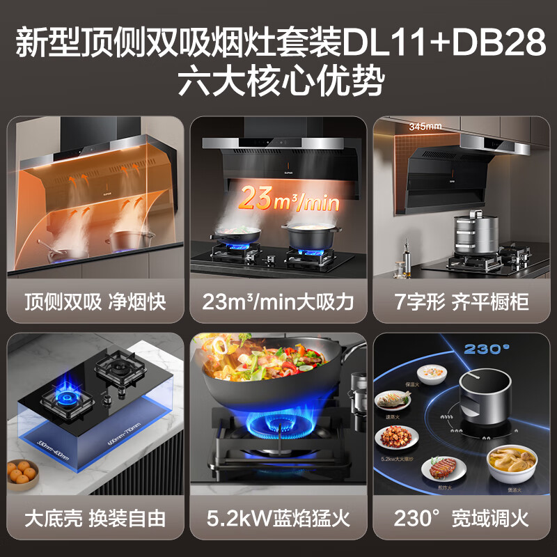 苏泊尔(SUPOR)抽油烟机 顶侧双吸7字型烟灶套装23立方挥手免拆洗家用烟机燃气灶具套装DL11+DB28液价格:1969.00元!