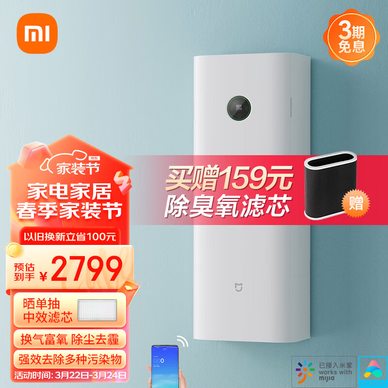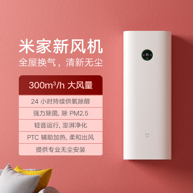 米家小米新风系统 家用壁挂新风机 全屋通风换气300m3/h适用105㎡ 除菌除甲醛 电辅热功能价格:2799.00元!